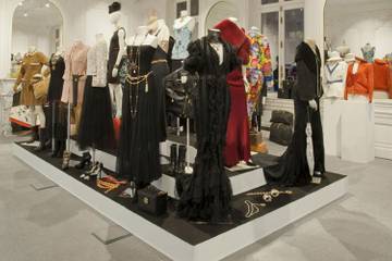 A côté d'une robe de cocktail Azzedine Alaïa est exposé un tailleur à jupe courte Versace, datant de 1991, sur lequel sont imprimés des portraits de James Dean et Marilyn Monroe façon Andy Warhol, avec legging, sac et chaussures assortis. Une tenue que Mouna Ayoub n'a jamais mise, explique-t-elle, en raison de l'opposition de son mari de l'époque, le milliardaire saoudien Nasser al-Rashid. "Même avec le legging, mon ex-mari n'acceptait pas que je mette le tailleur parce qu'il montrait quand même mes jambes, donc finalement j'ai fini par ne jamais le mettre", explique Mouna Ayoub. "Je l'avais mis sur un mannequin chez moi pour pouvoir le regarder comme si c'était un tableau".