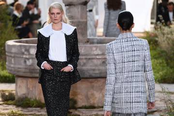 Les incontournables tailleurs sont revisités avec des jupes en tulle superposées sur celles de tweed qui rendent l'allure fraîche et aérienne. Très sage, la top Gigi Hadid est habillée en robe noire longue garnie d'un col Claudine et manches avec cols et manches blanches. L'Autralo-Saoudienne Adut Akech défile en blouse blanche au col Berthe sur une longue jupe noire à volants fluide. La robe bustier de Kaïa Gerber est dotée d'un nuage en tulle noir recouvrant les épaules.