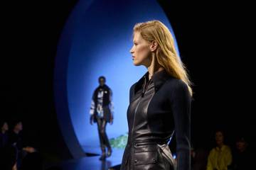 Prônant une "sensualité savamment harnachée mais jamais entravée", Hermès habille ses mannequins de combinaisons en cuir, de robes courtes zippées sur le devant, de manteaux à col en mouton toscan, mais aussi de cyclistes sous des vestes à poches plaquées sur la poitrine. Dans des couleurs allant du jaune soufre au bordeaux, en passant par le vert forêt, pour une allure décidée.