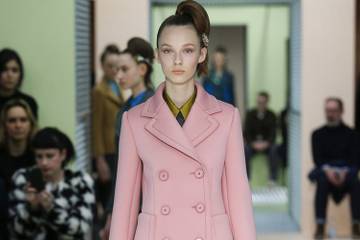 Chez Prada, les tailleurs et petits manteaux en tweed, Princes de Galles et autres chevrons sont colorés et joyeusement détournés. Vestes et manteaux sont privés de manches, laissant dépasser les manches courtes de chemisettes ou micro pullovers aux coloris pimpants, tout en mettant en valeur les longs bras fins des mannequins gantés de cuir (coloré !) jusqu'aux épaules. Les robes ballons à fines bretelles se parent sur les épaules ou sur le devant, en bandes verticales, d'inserts de fourrure teinte ou de rubans à gros noeuds décorés de boutons strassés.
