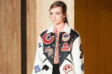 En fin de journée, Coach a présenté sa seconde grande collection après celle de septembre, qui marquait l'entrée de plain-pied du groupe dans le prêt-à-porter. Le créateur maison, le Britannique Stuart Vevers, a choisi de conserver un riche éventail de couleurs, transposé dans un univers influencé notamment par le sportswear. Témoin ces combinaisons de "varsity jacket" ou "letterman jacket", le blouson "teddy" en français, et le décor, un parquet et les lignes d'un terrain de basket, avec le public en tribune. Les couleurs, le rose et le rouille notamment, étaient aussi présentes sur chemisiers, jupes et robes, avec un zest de western apporté par des carreaux et certains motifs.