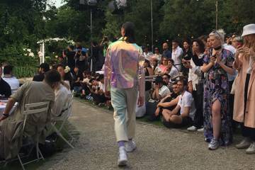 Pour son défilé, le créateur a choisi le jardin du Musée de Montmartre. Au milieu des tables blanches dressées dans la pelouse et parmi les fleurs, comme lors d’un mariage, les modèles marchaient devant les invités habillés de blanc, le thème du dresscode.