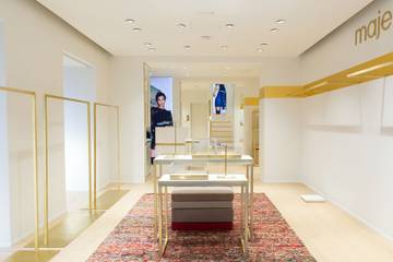 Déjà installée au numéro 33 de l’avenue des Champs-Élysées, la griffe affirme davantage sa présence en déménageant à deux pas de là au numéro 35. Maje double ainsi la mise en s’installant sur une surface de 120 mètres carrés déclinée sur deux niveaux. Aménagée selon le nouveau concept de boutique « Nomade Moderne » inauguré à New-York en 2014, celui-ci évoque une certaine idée du luxe à la Française dans un décor chic et épuré. Parquet en bois blond et marches en marbre viennent contraster avec des portants en laiton. Tandis qu’une longue bande graphique réalisée à la feuille d’or vient habiller les murs blancs de la signature maison. L’atmosphère est réchauffée par de longs rideaux en feutre grège, un tapis en toile de jute multicolore et de gros coussins de sol reliés entre eux par un jeu de sangles en veau velours brun. Rien n’a été laissé au hasard.
