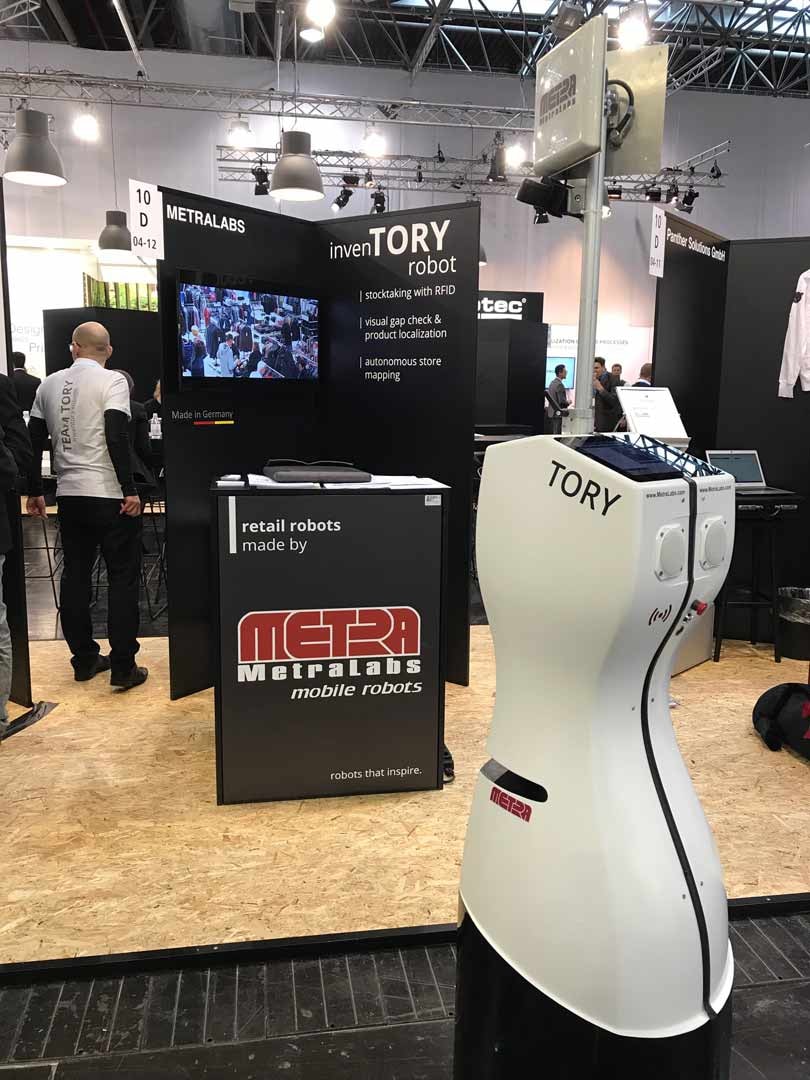 Het grootste probleem was tot nu toe de vraag hoe de store gedigitaliseerd kan worden. Hoe wordt bijvoorbeeld herkend, hoe klanten zich in een winkel gedragen, welke producten ze passen maar niet kopen? Hoe worden de locaties van de producten in de winkel gedigitaliseerd? Een oplossing is het gebruik van robots. Zo presenteerde MetraLabs een mobiele robot, die 's nachts door de winkel rijdt en daar met RFID-technologie producten telt. Hij herkent ook, of er producten ontbreken en of ze zich op de juiste plek bevinden. Bij het Duitse modemerk Adler wordt deze robot al gebruikt. Hij moet 's nachts drie tot vier uur worden ingezet. „Dat is de eerste stap naar de digitalisering van de winkel“, legt dr. Andreas Bley van MetraLabs uit, en de noodzakelijke voorwaarde om bijvoorbeeld kunstmatige intelligentie in de winkel te kunnen gebruiken.<