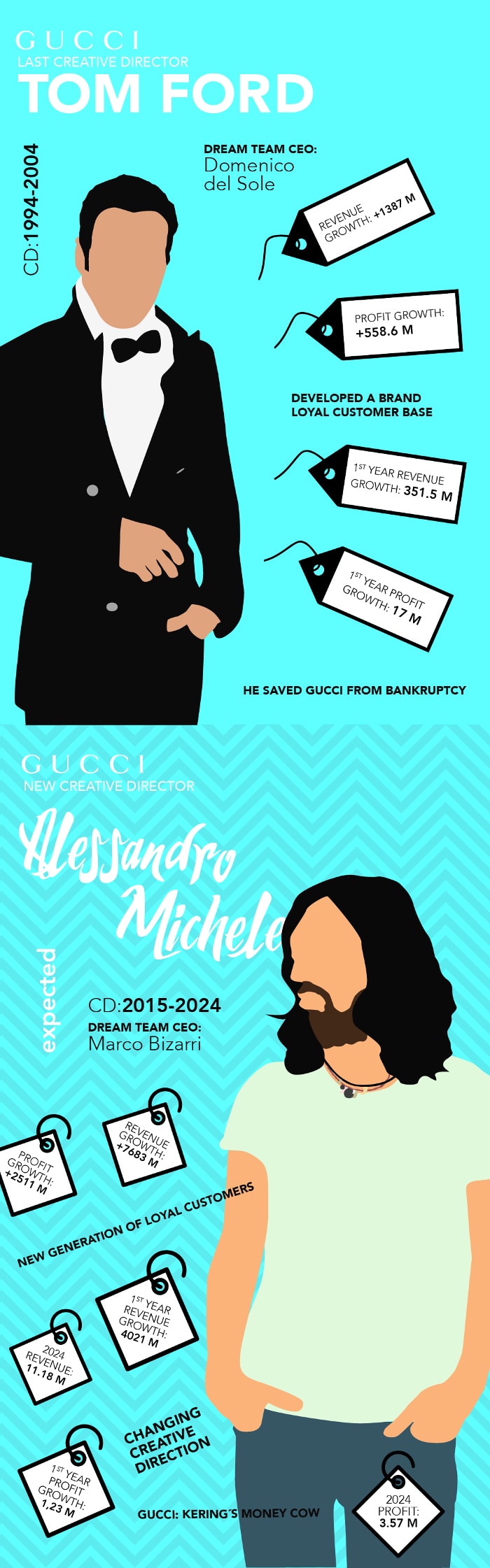 Hoewel Alessandro Michele in korte tijd veel voor Gucci heeft betekend, kan hij toch niet worden gezien als ´de nieuwe Tom Ford´. De laatste was, samen met De Sole, namelijk verantwoordelijk voor Gucci´s redding van de ondergang. Bij het aantreden van Michele kan Gucci´s financiële situatie niet worden vergeleken met de situatie aan het begin van de jaren ´90. Ford heeft Gucci destijds niet alleen een nieuwe look gegeven, maar zijn invloed ook laten gelden wat betreft het assortiment, de prijsstrategie, de marketing en het imago van het merk. Gucci´s situatie is vandaag de dag een stuk beter te noemen dan het geval was in begindagen van Ford, en daarom is het onwaarschijnlijk dat Michele dezelfde impact op het merk zal hebben.