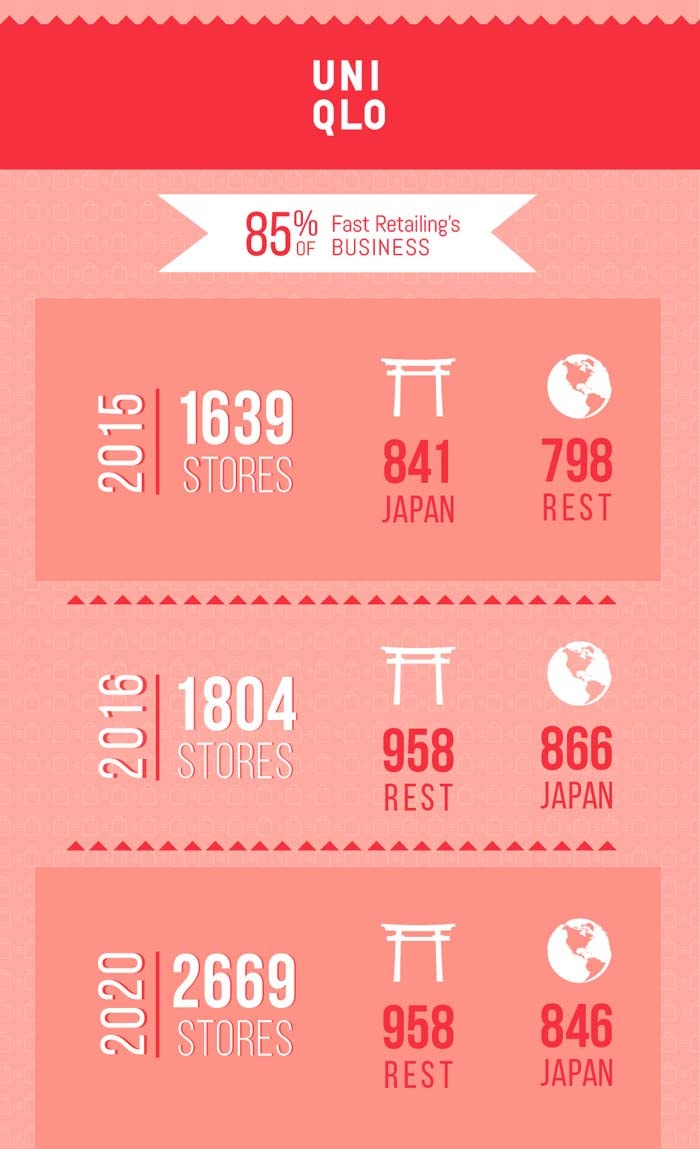 Hoewel Uniqlo in de Verenigde Staten niet van de ene op de andere dag een doorslaand succes werd, is het bedrijf er in thuisland Japan in geslaagd een heel goed concept neer te zetten. Uniqlo heeft op dit moment 811 zelfstandig opererende winkels en nog eens 30 franchises. In 2013 had de retailer nog 834 winkels en 19 franchises, maar moederbedrijf Fast Retailing koos bewust voor een nieuwe strategie waarbij het bedrijf zou gaan werken met een kleiner aantal grotere winkels. Afgaand op de omzetcijfers van het bedrijf lijkt het een slimme zet te zijn geweest. De 834 winkels die Uniqlo in 2013 had, brachten een omzet van 5,3 miljard dollar (4,8 miljard euro) op, terwijl het bedrijf in 2015 met 811 winkels een omzet genereerde van 6 miljard dollar (5,4 miljard euro). De gemiddelde verkoop per winkel is hiermee gestegen van 6,4 miljoen dollar (5,8 miljoen euro) in 2013 tot 7,3 miljoen dollar (6,6 miljoen euro) in 2015.