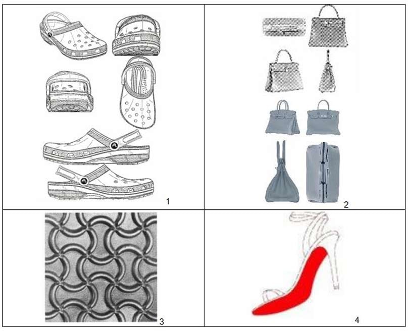 Vier niet-traditionele merken: de vorm van de schoenen van Crocs*1 (illustratie 1), de vorm van de handtassen van Hermès International S.A (2), het oppervlaktepatroon van de Birkenstock-schoenen (3), waarvan het Benelux-gedeelte op 14 maart 2018 door de Rechtbank Den Haag weg werd vernietigd als merk voor schoenen, en het rode zool-merk van Louboutin*2 (4).
