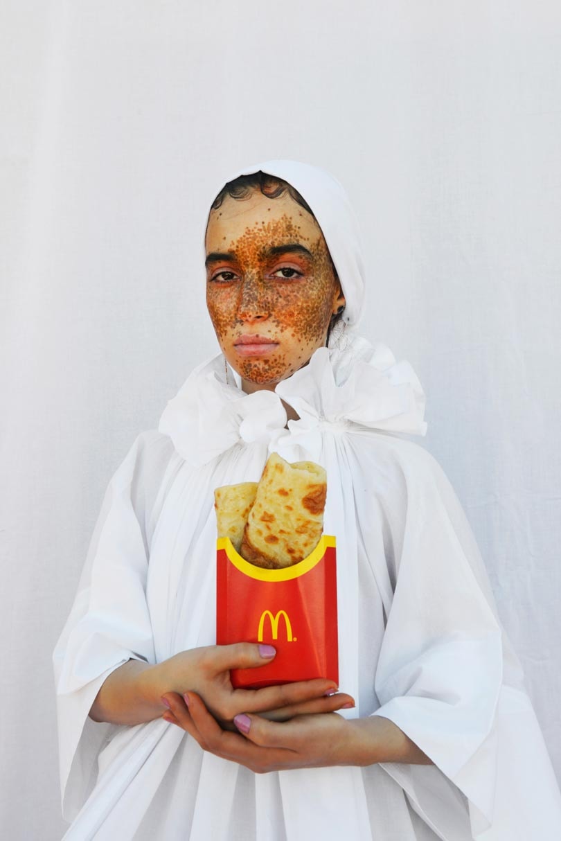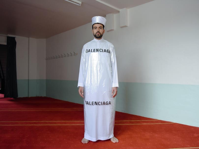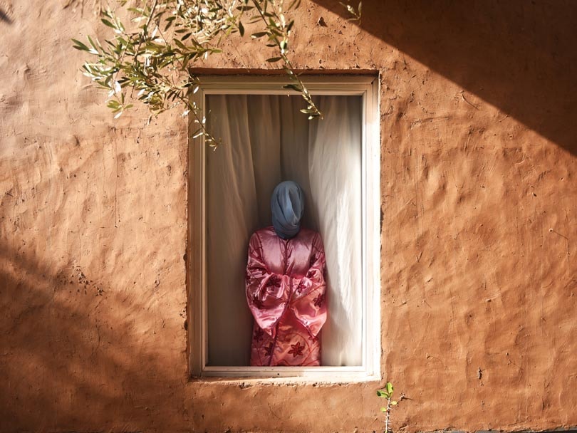 Lamrabat studeerde interieurontwerp aan de Koninklijke Academie voor Schone Kunsten in Gent, maar werd internationaal bekend als fotograaf en visueel storyteller in de mode- en fotografiewereld. Zijn werk was al te zien in onder andere Elle, Weekend Knack en DS Magazine en op verschillende internationale platforms. In zijn solo-expo zitten veel verwijzingen naar de modewereld én naar zijn Vlaams-Marokkaanse identiteit, waar hij soms nog mee worstelt. De beelden zijn absurd, surrealistisch, kleurrijk en vaak voorzien van een kwinkslag. “Voor mij hebben al deze foto’s met mode te maken,” vertelt hij aan FashionUnited. “Het is niet zo dat als je met kleding werkt, dat het ineens ‘mode’ wordt. Ik zeg ook altijd tegen beginnende stylistes dat hun styling goed is als deze juist niet opvalt. Niet andersom.”