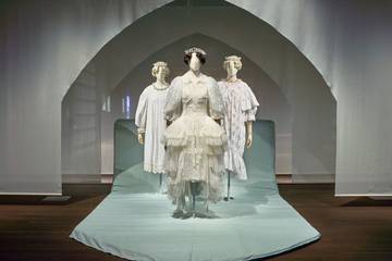 Als begrip is ‘het meisje’ zelfs relatief jong. Tot ver in de achttiende eeuw was er namelijk geen plaats voor meisjestijd, zien we in een proloog op de tentoonstelling. Kinderen werden als kleine volwassenen beschouwd, en er was al helemaal geen sprake van een onderscheid tussen kinder- en volwassenkleding. Dat gebeurt pas met de komst van nieuwe inzichten in de romantiek, vanaf dan is er voor het eerst sprake van kinderkleding. Het duurt zelfs nog tot de twintigste eeuw voor er een opdeling komt tussen jongens en meisjes. Meisjeskleding wordt dan restrictiever en decoratiever, om hen voor te bereiden op de traditionele rol als moeder en huisvrouw. Behalve een eerste werk van Sophia Lai - MoMu liet haar drie nieuwe sculpturen maken voor deze expo – duikt er in de inleidende ruimte een eerste van de vele archetypes uit de meisjestijd op: de Mary Jane-schoen, hier als wassen sculptuur van Robert Gober. Het sluitstuk van de proloog is een topstuk: de Petite danseuse de quatorze ans van Edgar Degas.