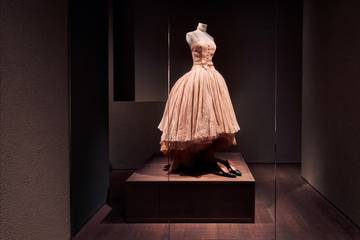 Jurken van Dior zijn zeer exclusief: de 48 meter organdie, voor de rok alleen, was ongezien in de naoorlogse tijden van schaarste. Het leverde de ontwerper kritiek én publiciteit op, weet MoMu. Dior zocht steeds manieren om te vernieuwen. Door achteraan volume te creëren refereert de rok van de japon naar de eind negentiende-eeuwse tournure.