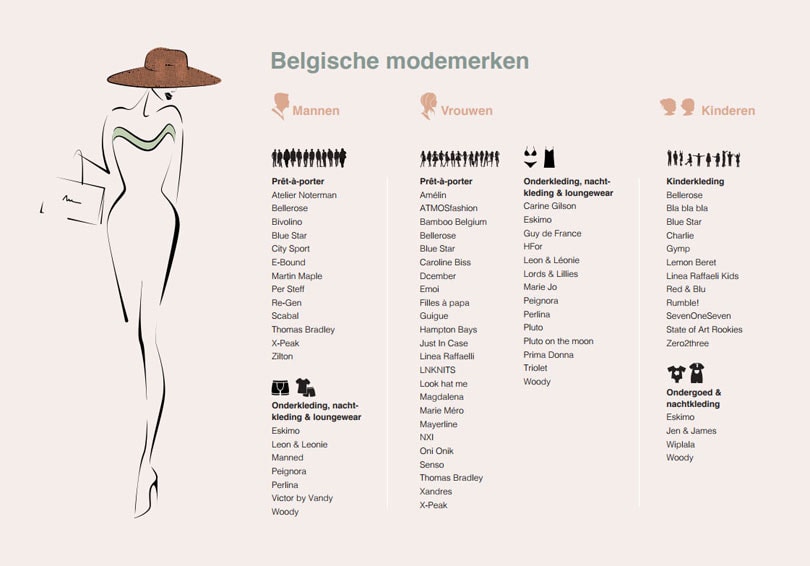 "De modecollecties van merken van eigen bodem verkopen goed, maar de consumenten weten daarom nog niet per se dat het Belgische merken zijn. We moeten de merken nog wat dichter bij de consument brengen", verklaart Luyckx tegen De Morgen.De bekendste nationale labels zijn Dries Van Noten, Caroline Biss, Natan, Essentiel, Eskimo, Mayerline, Terre Bleue, Marie Jo, PrimaDonna, Woody en Xandres