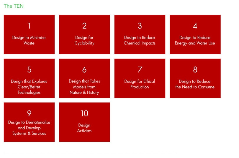 Een van de resultaten van Mistra Future Fashion onderzoeksprogramma voor duurzame mode is een serie van tien kaarten ‘The ten’. Elke kaart staat voor een duurzame strategie gekoppeld aan het ontwerp, zoals design om afval te minimaliseren, design dat betere technologieën exploreert of de behoefte om te consumeren vermindert, tot en met design activisme. Samen vormen de kaarten een richtlijn om nieuwe consumptiepatronen en bedrijfsmodellen te creëren en designers te voorzien van praktische richtlijnen voor verandering.