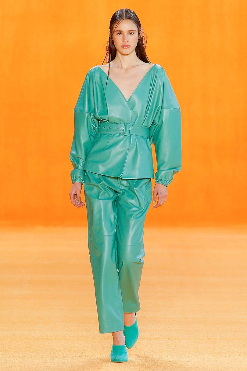 Een ‘coole en verfrissende’ aquatint. Sally Lapointe, Marco de Vincenzo en Vivetta presenteren total looks in de kleur. We spotten Biscay Green ook bij Gucci. Agnona en Stella McCartney combineren de kleur met kaki.