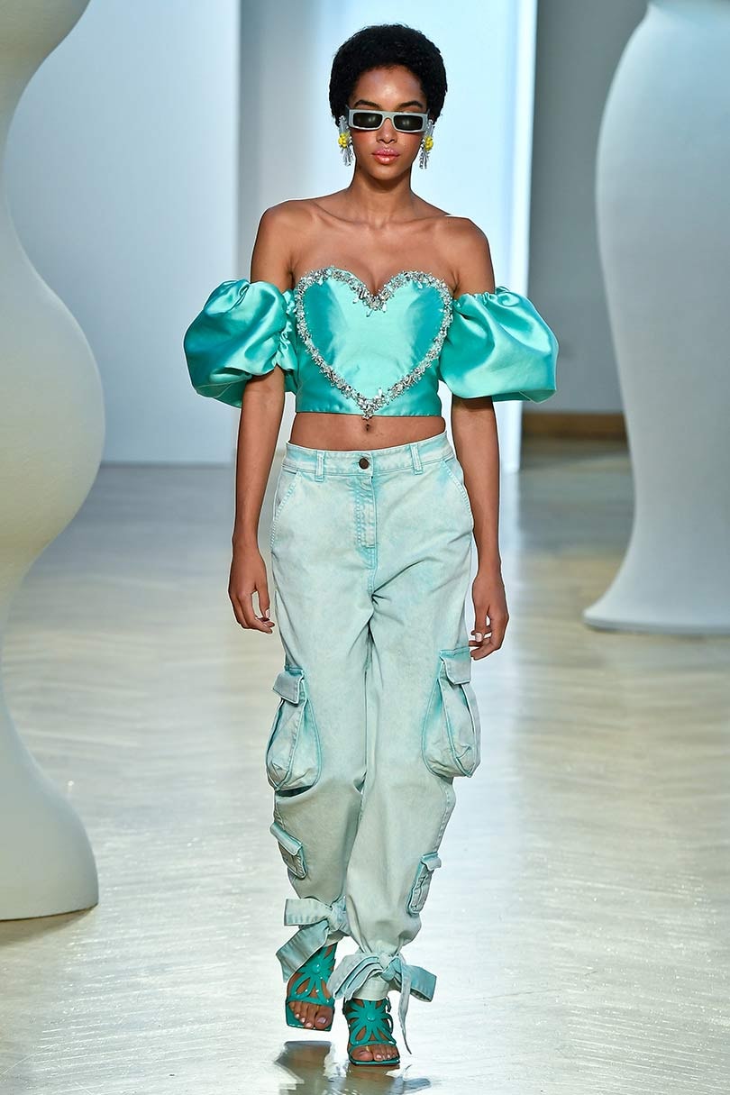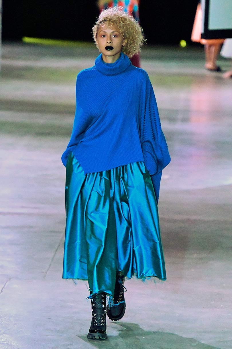 Richard Malone, Marques Almeida, Boss en Versace gebruiken de groenblauwe (of zoals in het Engels teal) tint 'Mosaic Blue' in hun collecties.
