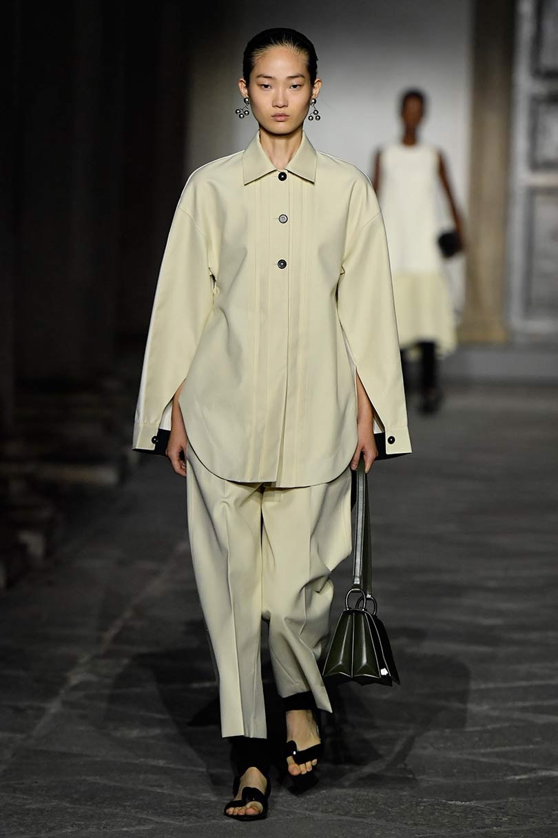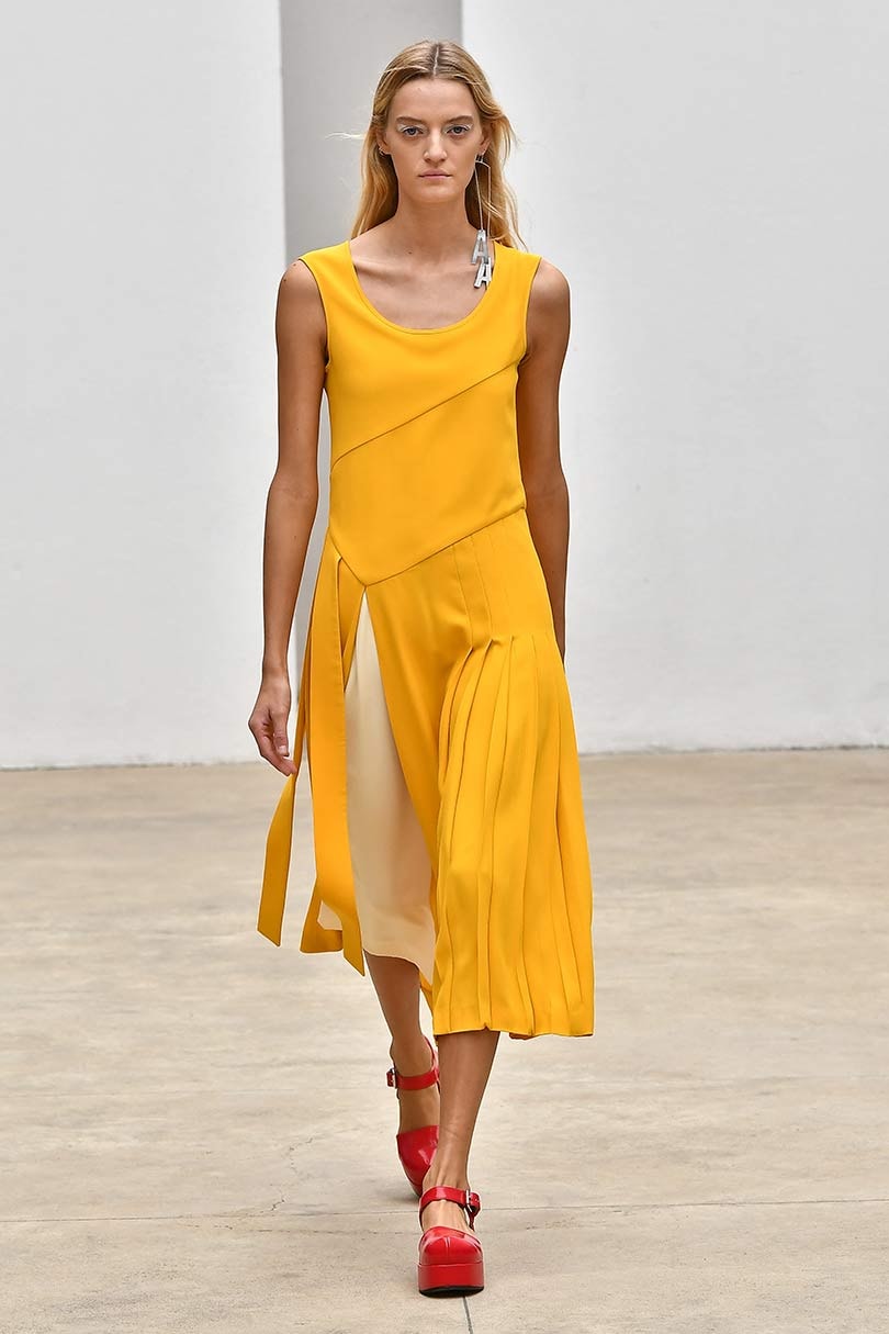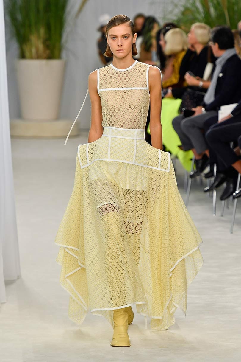 Sunlight kan volgens de modehuizen zakelijk en casual. Maar het liefst van top tot teen. Christian Wijnants, Jil Sander en Proenza Schouler presenteren (varianten op) het vrouwenpak in vrolijk zachtgeel. Ook spotten we de kleur in een kanten Loewe jurk en andere romantische exemplaren van Rushemy Botter and Lisi Herrebrugh’s Nina Ricci, JW Anderson en Christian Wijnants.