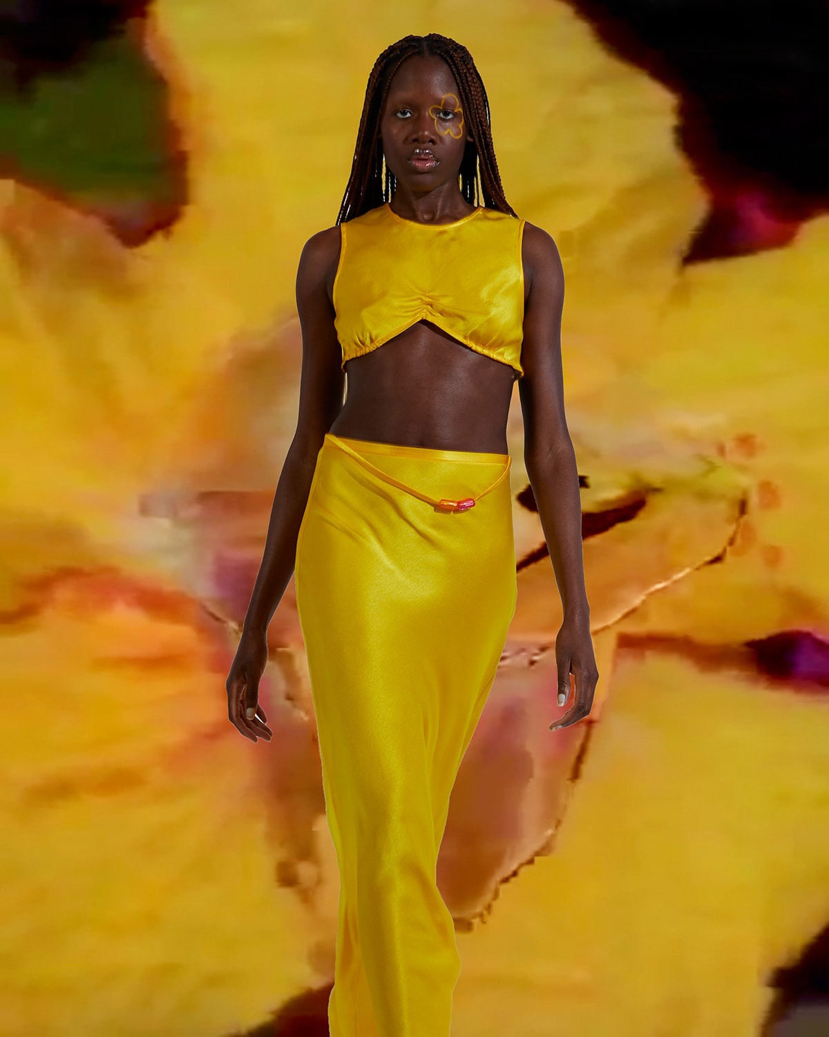 De Marigold-kleur (goudbloesem) is populair in het SS21-seizoen. Het komt zowel in het LFW als NYFW-rapport van Pantone voor. De ‘gele kleur is doordrenkt met goud en oranje en heeft een verwarmende aanwezigheid’ aldus het rapport.