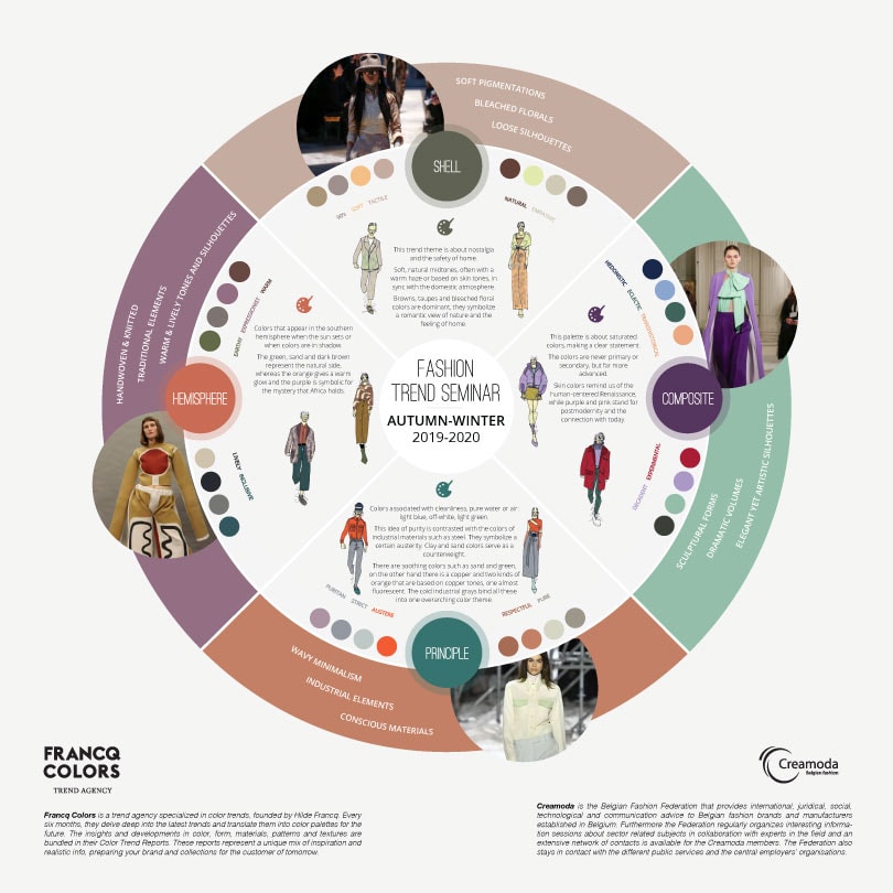 Hilde Francq is trendwatcher, om het halfjaar brengt haar bureau een kleurentrendrapport uit lifestyletrends, kleurenpaletten, suggesties voor materialen en texturen, inspiratiebronnen. Handig voor bedrijven die een toekomstgericht productaanbod en kleuren- en materialenpalet nastreven dat de consument zal aanspreken. Voor herfst-winter 2019/2020 onderscheidt ze vier lifestyletrends, elk met een eigen kleurenpalet en modebeeld. In het algemeen voorspelt ze extra focus op kleur in de collecties waarbij diepbruin de plaats inneemt van zwart. Kleur geeft objecten en materialen meer dimensie.