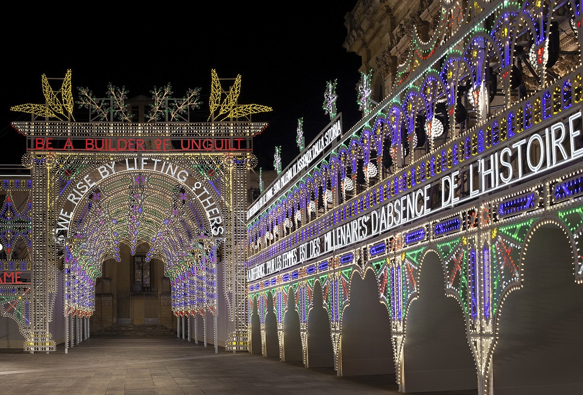Ondanks de livestream van Dior’s nieuwste show greep deze terug naar een meer traditionele Fashion Week opzet met echte modellen en epische decors. Voor de onthulling van de Dior Cruise 2021 collectie werkte het modehuis samen aan de scenografie met multidisciplinair kunstenaar Marinella Senatore, die gebruik maakte van traditionele verlichting als achtergrond voor haar tekstkunst, met 1,5 km aan ledverlichting die teksten vormde die verwezen naar feminisme en de ‘empowerment’ van vrouwen.