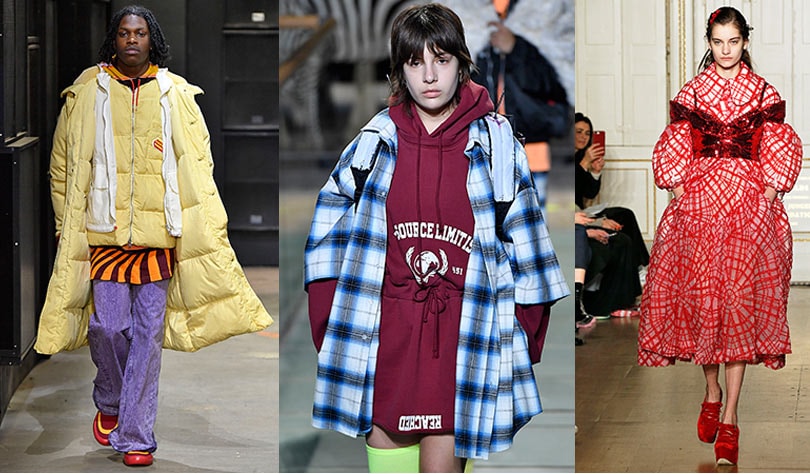 Een blijver is de donsjas, bron van experiment bij doudoune-expert Moncler, Chanel, als jurk bij Marine Serre en Simone Rocha, de dubbele jas bij Iceberg, Marni en Philipp Plein of enorm volumineus bij Vetements en Balenciaga. Nog enorm volumineus: de mouwen en/of schouders van blouses en jurken bij Gucci, Y/Project, Versace, Lutz Huelle enz. Ook oversized is een blijver, zoals de grote jurken van Simone Rocha, Mark Jacobs en Mary Katrantzou of nieuwkomer Tomo Koizumi. Ook pakken en broeken zijn graag te groot, voorbeelden vind je onder meer bij Tod's, Y/Project, Balenciaga en Gucci. Nog XXL is het overmaats tricot en de te lange mouwen in verschillende shows.