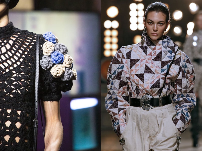 Naast veel kant (in alle kleuren), glanzende materialen, hardcore leer (als verwijzing naar punk) is er opnieuw een hang naar folklore breiwerk in het materiaaldepartement. Het hangt wat samen met de vraag naar het ambachtelijke en het zoeken naar connectie, het groepsgevoel, in de maatschappij. Bij Chanel, Lanvin en Sacai uit zich dat in retrobreiwerk en tartan, Isabel Marant vertaalt de tendens in de vorm van quilting. De kleuren gaan deze winter richting natuur: mosterd- en aardekleuren in al hun varianten, van roestig tot beige, van geel en oranje tot bruin. Ook het klassieke zwart/wit keerde een aantal keer terug bovenop de alomtegenwoordige poppy colours. Felrood, oranje met fuchsia, knalpaars, liefst in een eighties-aandoende mix of voor een mix van materialen. Voorbeelden te over bij onder meer Chanel, Dries Van Noten, Vetements, Versace en natuurlijk ook Walter Van Beirendonck.