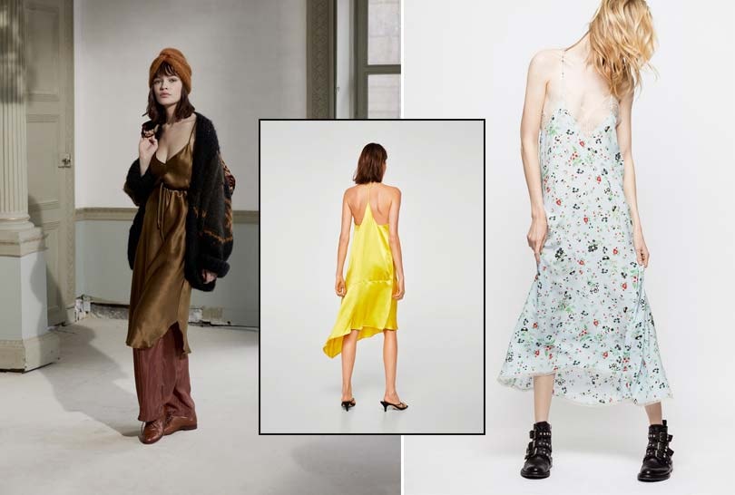 Ondermode gedragen als bovenkleding is een terugkerende trend. Hoewel de pyjama-dressing-trend nog voortduurt (Bottega Veneta), is het deze winter gedurfd te kiezen voor een zijden of satijnen slipdress, bekend uit de lingeriesector. Draag enkel de jurk, op de blote huid (Bluemarine, Givenchy) of combineer met een grote trui (zie de maxi-truien-trend) voor een “boudoir” look buitenshuis. In etalages wordt de slipdress gestijld met een lange jas of over een jeans. De slip dress is een nieuwe hit voor winter 2018.