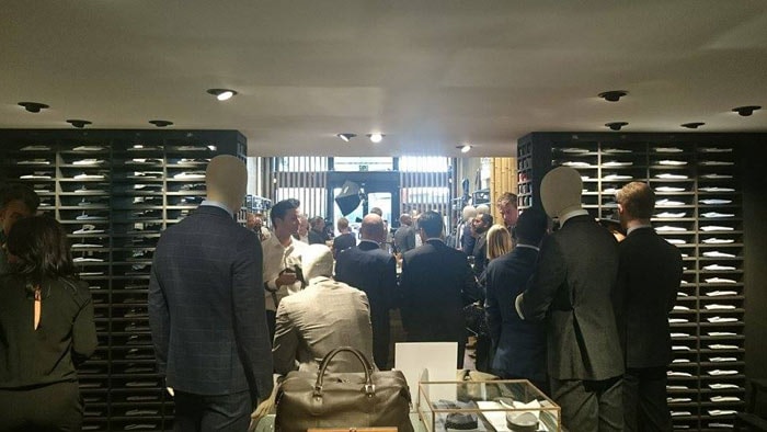 Bij de presentatie zijn de aanwezige mannen stuk voor stuk in pak gestoken, en de meeste vrouwen dragen een basic jurkje of een stijlvolle jumpsuit. Alle gasten lijken zich prima te vermaken met elkaar, en elke paar minuten komen er schalen met borrelhapjes voorbij. Aan de linkermuur van de winkel prijkt een grote campagnefoto waarop Tan een donkerblauw pak uit de collectie draagt, en daaronder hangt de collectie zelf. Robert Meijer, CEO van Van Gils, loopt rond en knoopt gesprekken aan met zijn gasten. Ook Tan maakt op zijn gemak een rondje door de winkel en praat hier en daar met iemand.