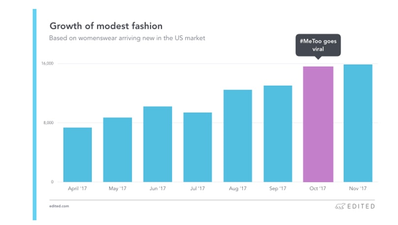 Moslim consumenten zijn de grootste kopers van de zogenoemde ‘modest fashion’. Volgens een recent rapport van Thomson Reuters Global wordt verwacht dat de totale uitgaven van moslims tot 2.6 biljoen dollar (ongeveer zo’n 2.3 biljoen euro) zal oplopen tot 2020, met mode als de beste presterende categorie. Maar religie is niet de enige reden waarom ‘modest fashion’ populairder wordt. Edited associeert de uitbreiding van het ‘modest’ assortiment met de #MeToo beweging, zoals getoond door de grafiek hieronder: