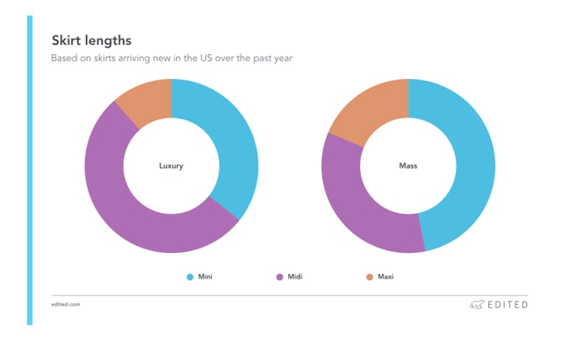 De zoom gaat ook naar beneden: ‘midi’ rokken vormen 53 procent van het hele aanbod van rokken in beide landen, met merken zoals Gucci, Marni, Tibi en Jil Sander als leiders in het segment. Maxi skirts hebben het kleinste percentage van de rokkenmarkt in zowel de VS als het VK, maar consumenten blijken ze steeds aantrekkelijker te vinden: het silhouet is in de luxemarkt met 67 procent gegroeid het afgelopen jaar terwijl de het middensegment een groei zag van 55 procent.