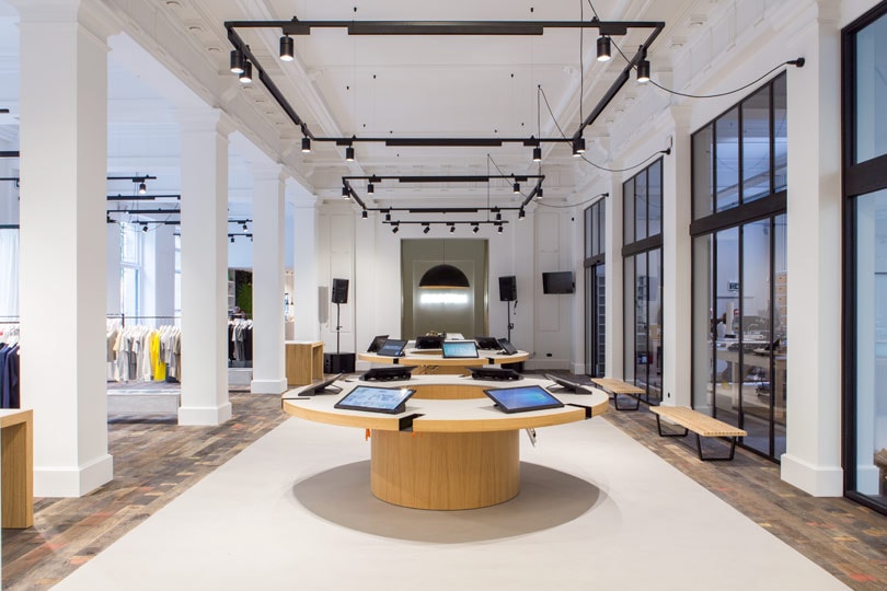 Niet alleen de sweaters, polo’s, T-shirts en broeken zijn milieuvriendelijk, ook de inrichting is eco, met meubels en vloeren van gerecycleerd hout. Locatie is het imposante historische pand van de vroegere Banque De L'union Anversoise aan de Graanmarkt, goed voor 650 vierkante meter die voor een keer niet gevuld zijn met winkelrekken, een grote stock of kassa’s. Wel hangt er een beperkt aantal samples dat je kan keuren en betasten.