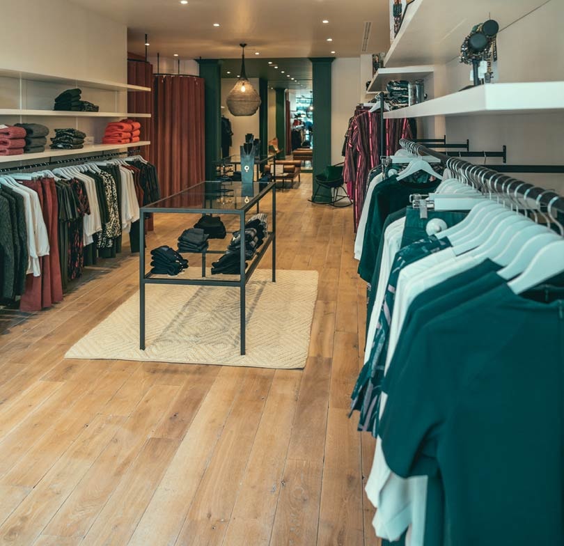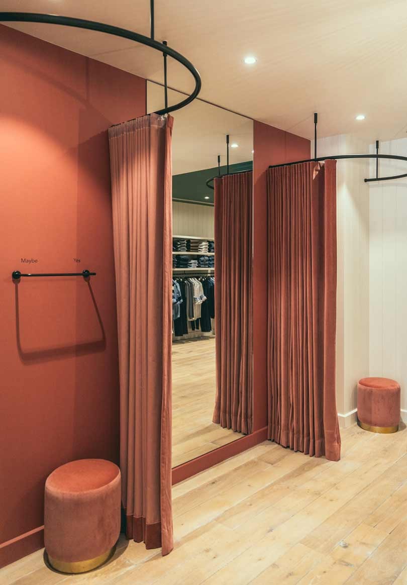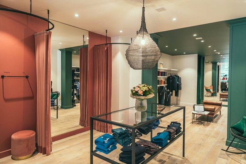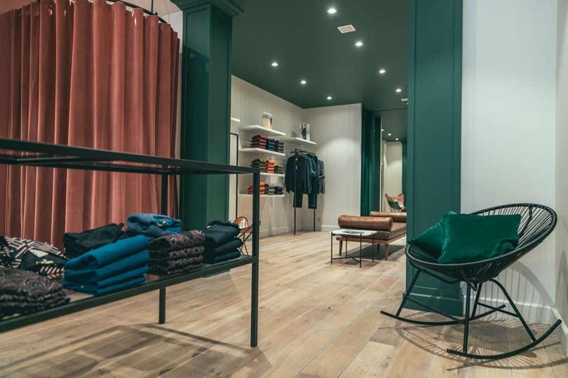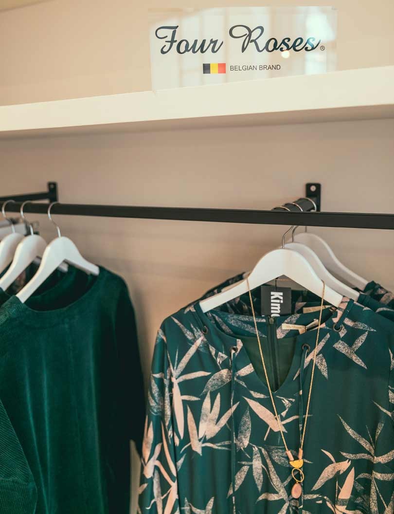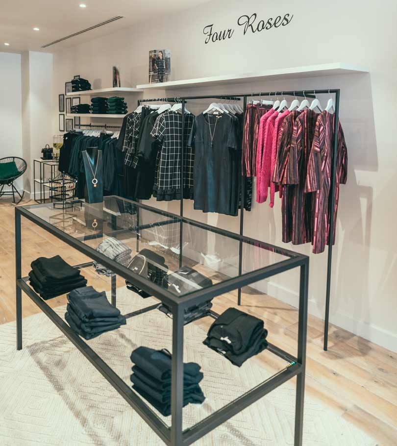 Voor in de winkel is de collectie van Four Roses te vinden, waarna de winkel wordt opgesplitst door de paskamer. Achterin tegen een donkergroene wand is de collectie van Bronson te vinden. Met het concept wilde de winkel een boudoir-achtig interieur neer zetten. In de winkel zijn roze fluwelen gordijnen te zien, een marmeren toonbank en gouden accenten bij de vrouwen. “De Four Roses-vrouw en de Bronson-man kunnen in alle sereniteit een kledingstuk van Belgische makelij passen,” aldus het persbericht destijds.