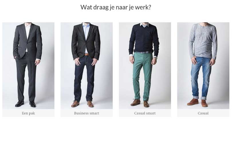 Wat draag je in je vrije tijd? En naar je werk? Een pak, een casual stijl of casual smart? Wat voor schoenen heb je in je kast? En hoe oud voel je je? Mannen hoeven maar een paar keer hun muis te bewegen en te klikken en tadaa: hun kledingstijl is bepaald. Vervolgens belt een personal shopper of stylist. Facebookchat mag ook, als je niet zo’n beller bent. Een paar dagen later staat de postbode voor de deur met een doos met gemiddeld voor 1000 euro aan kleding en accessoires. Wat je niet wil kun je gewoon terugsturen.
