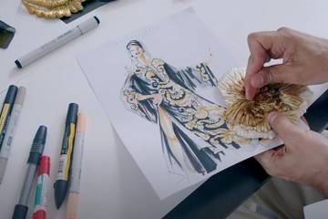 De ambachtsman gebruikt materialen zoals lurexstof en gehaakte raffia om de Alta Moda-look te creëren. Versterkt door de contrasten van gouden details op een zwarte georgette-achtergrond, is het uiteindelijke effect elegant en uniek. Bekijk hieronder de video van hoe het maken van de kaftan er aan toe ging bij modehuis Dolce & Gabbana.
