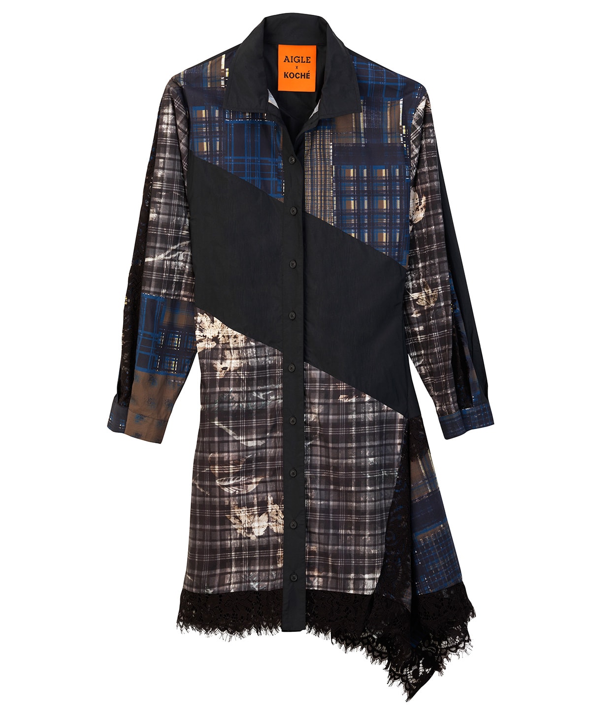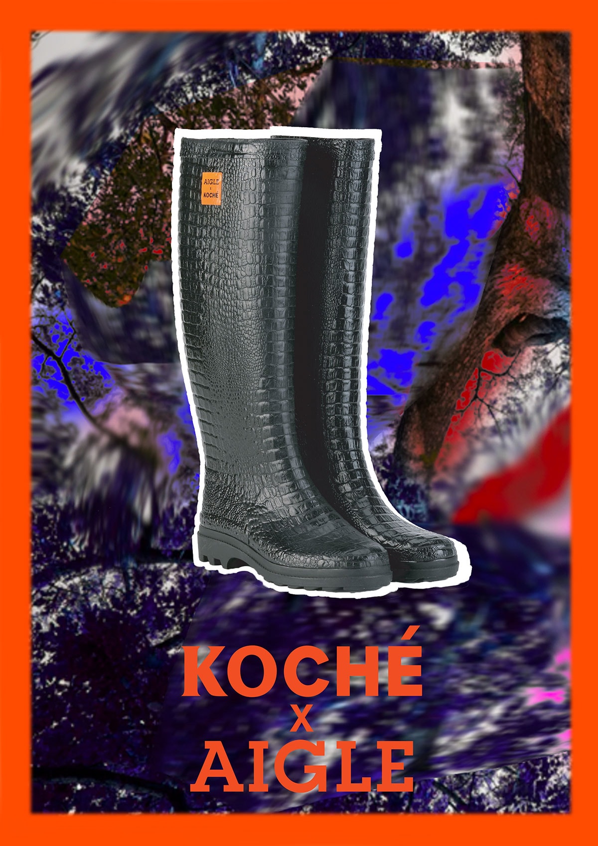 KOCHÉ is het creatieve geesteskind van ontwerpster Christelle Kocher, dat sinds zijn lancering in 2014 vooral geroemd wordt voor zijn sterke signature style die couture met een streetwear vibe verenigt. Voor deze samenwerking kreeg de Parisienne carte blanche voor een herinterpretatie van enkele klassiekers uit de garderobe van Aigle. Het resultaat is een eigentijdse capsulecollectie die couture, streetwear en artisanale knowhow verenigt in hertekende modellen met opvallende stiksels en patchwork.