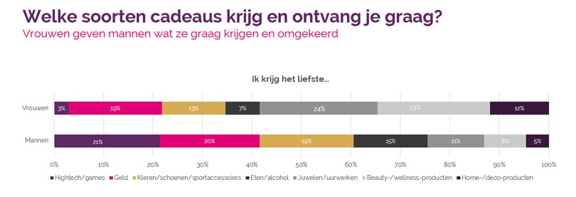 - Mannen willen hightech, geld of kledij. Vrouwen juwelen en schoonheidsproducten.