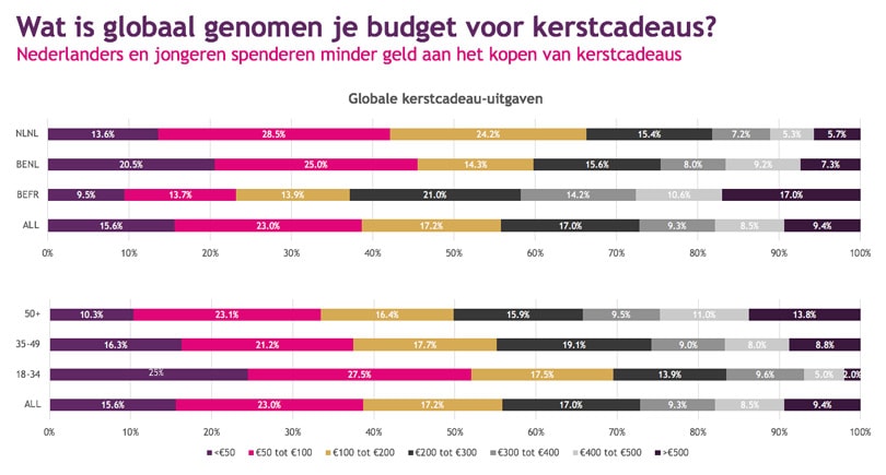Volledig binnen de verwachtingen, bevestigt het onderzoek ook dat hoe ouder de koper, hoe hoger het budget ligt. 13,8% van de vijftig plussers besteedt meer dan € 500 aan kerstcadeautjes, terwijl dit in de categorie onder de 34 jaar maar 2% is.