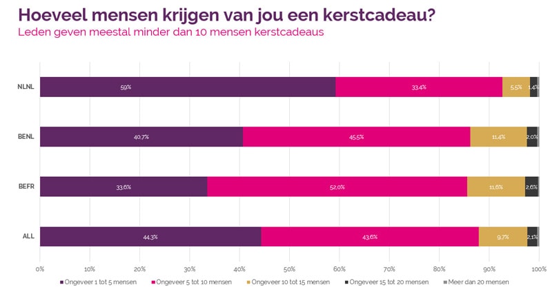 60% van de Nederlanders geeft cadeautjes aan maximaal vijf personen. Ruim de helft van de Franstaligen schenkt een pakje aan vijf tot tien mensen. Dubbel zoveel Belgen als Nederlanders (ruim 11% versus 5,5%) geeft cadeaus aan tien tot vijftien personen.