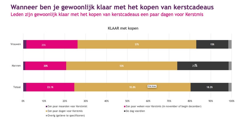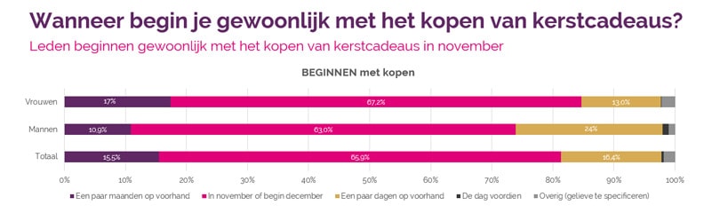 66% van de respondenten start al in november of begin december met zijn zoektocht naar cadeautjes. Twintig procent beëindigt zijn aankopen pas op het allerlaatste moment en koopt zijn laatste geschenken pas op 24 december.