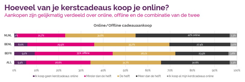 Nederlanders kopen hun kerstcadeaus vooral online: 42% koopt meer dan de helft van zijn cadeaus online. Bij Franstaligen is dat maar 23,9%, 9% van hen koopt zelfs helemaal niets online.